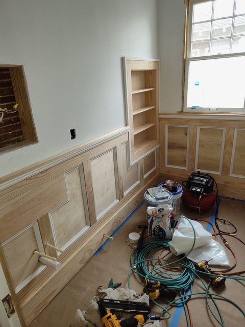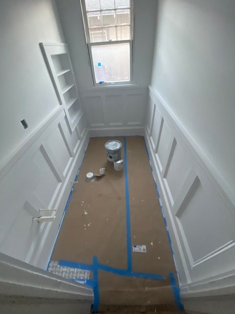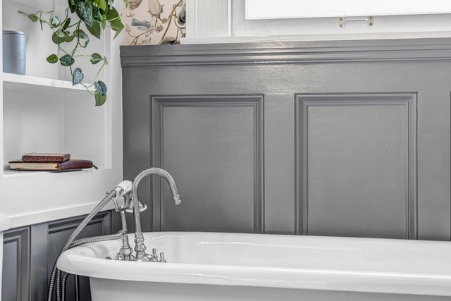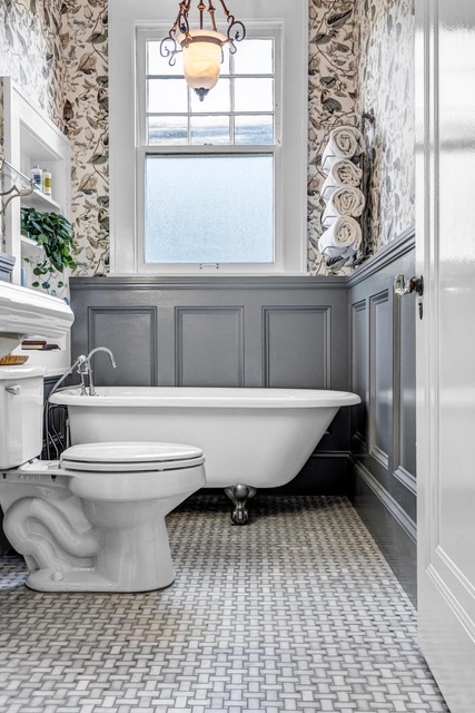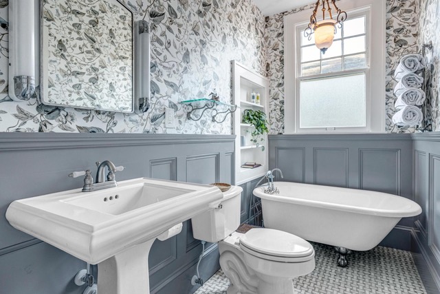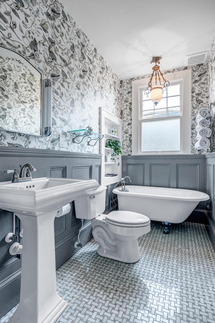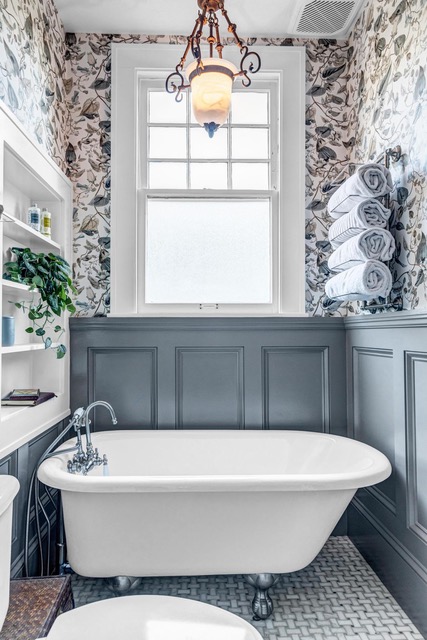 The claw foot tub was definitely a major part of the vision, because the husband had always wanted a space where he could enjoy long evening baths. From there, we layered in the blue wainscoting, traditional wallpaper, and custom built-in shelving to make the whole room feel warm, classic, and true to the home’s age.